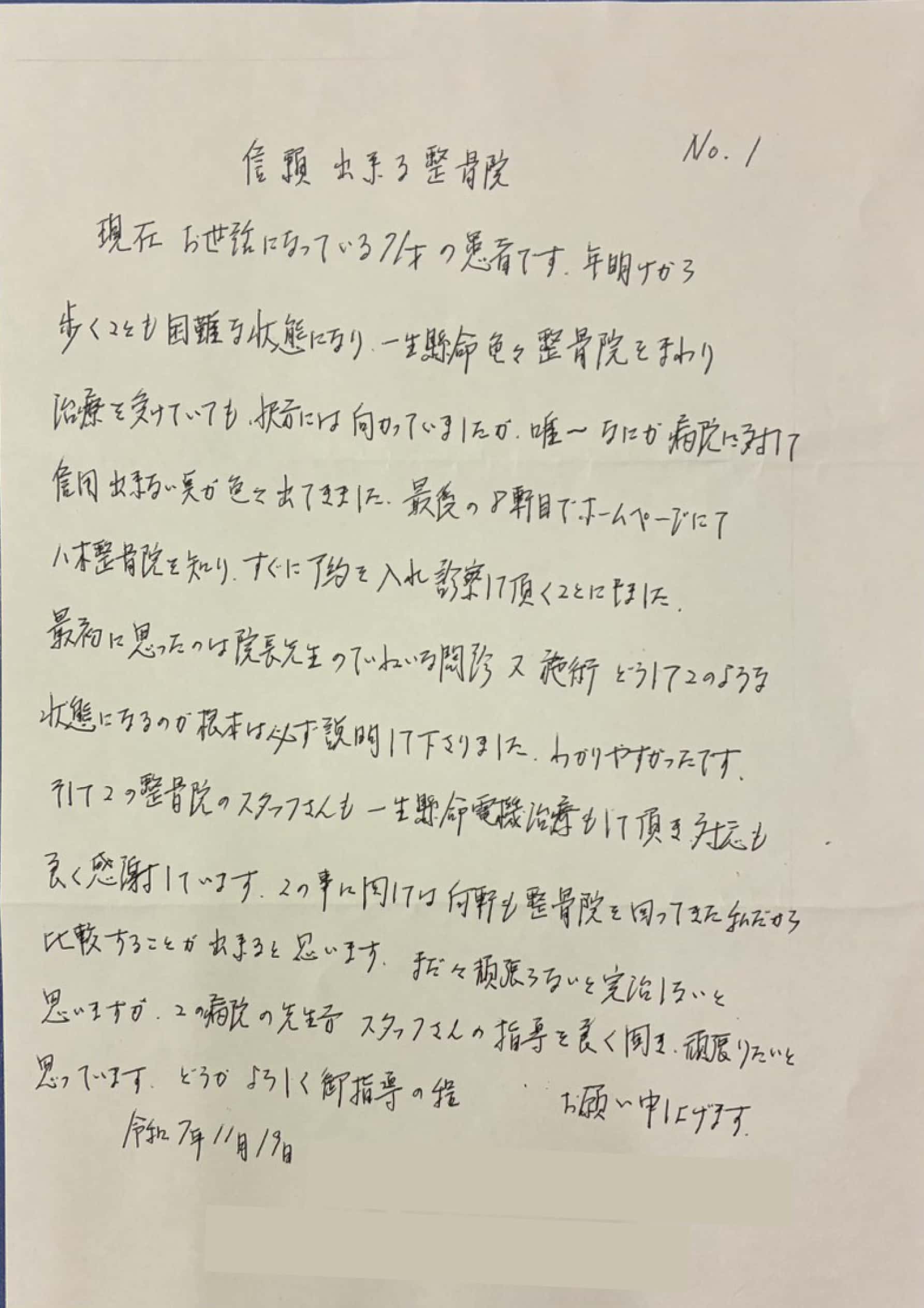 現在、お世話になっている71才の患者です。年期から歩くことも困難な状態になり、一生懸命色々整骨院をまわり治療を受けていても、快方には向かっていましたが、唯一なにか病院に対して信用できない臭いが色々出てきました。最後の8軒目でホームページにて八木整骨院を知り、すぐに予約を入れ診察して頂くことになりました。